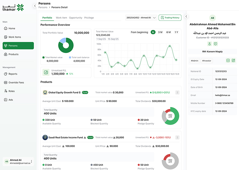 thamar was created by integrating international business norms and state-of-the-art technology to address inefficiencies in how investment firms manage investor services by replacing fragmented systems and manual processes with a single unified solution. The platform is built specifically for local market needs and is fully aligned with local regulatory frameworks. It integrates seamlessly with government services for eKYC and is designed to reflect the unique identity of each Capital Market Institution rather than offering a one-size-fits-all approach. thamar provides full investor-facing investment channels, along with an employee portal for internal activities. It also comes pre-integrated with omnibus bank accounts, payment gateways, and KYC compliance services, supported by a cloud-native and modular architecture that allows firms to scale as their business grows.